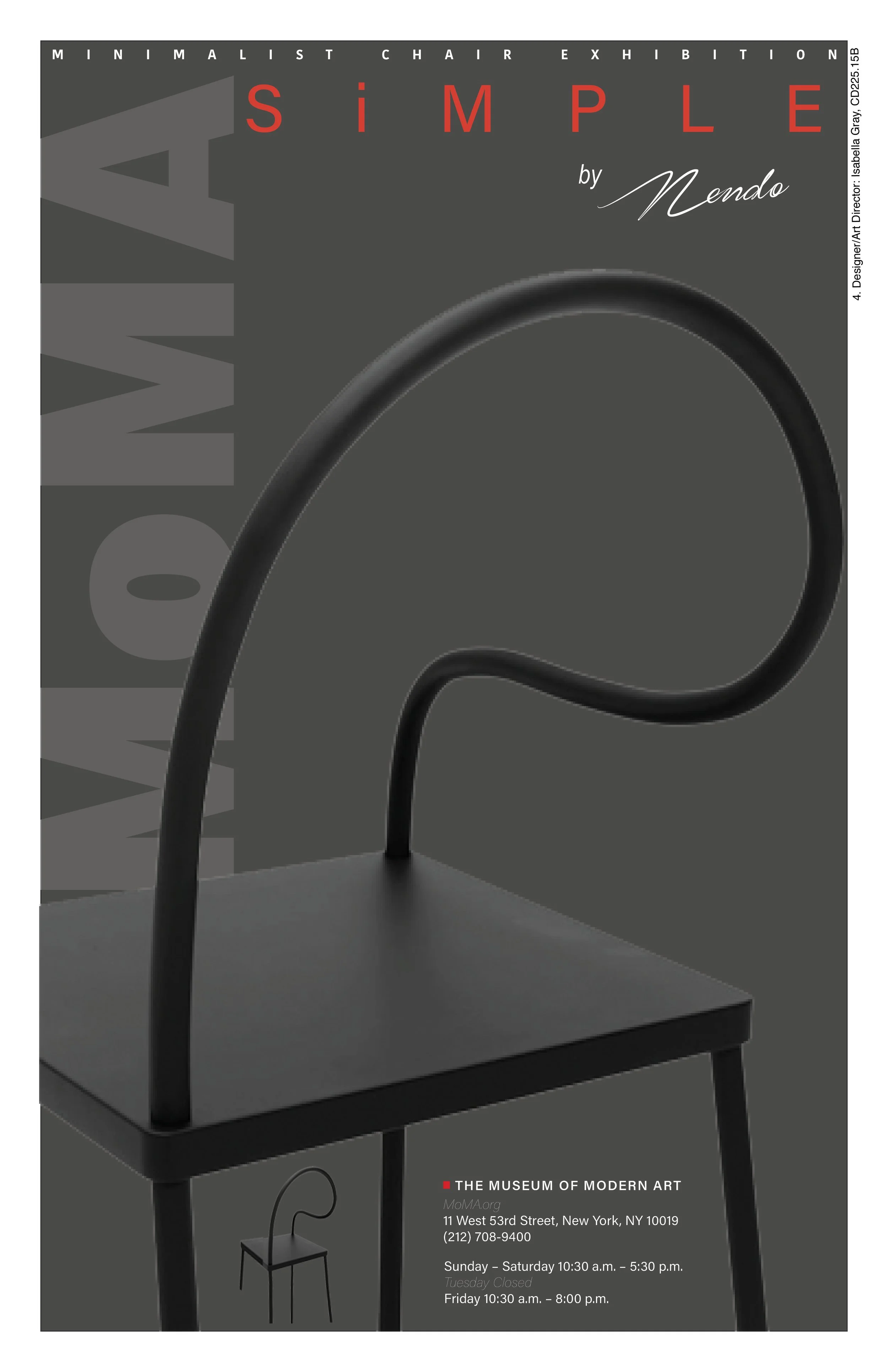 This poster explores minimalism through a refined composition inspired by a metallic chair with a soft, elegant curve. The fluidity of the chair informed the overall layout, introducing gentle movement and balance within a clean, open space. The typography was carefully selected to complement this form—featuring a modern, sleek typeface with subtle curves that echo the chair’s silhouette. By keeping the design simple and intentional, the poster emphasizes harmony between object and type, allowing the materiality and shape to guide a calm yet visually striking composition.